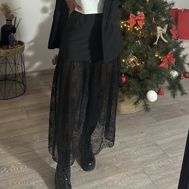 Notre jupe KRISTAL associe un haut satiné lumineux à un bas en dentelle délicate. Sa coupe lui confère modernité et élégance féminine.